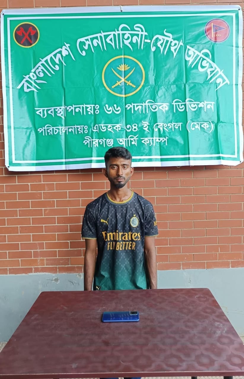 রংপুর পীরগঞ্জের সেনা ক্যাম্পের দায়িত্বরত ক্যাপ্টেন মো. রাকিবুল ইসলামের নেতৃত্বে পরিচালিত বিশেষ টহল দল বুধবার (২৭ আগস্ট) দুপুরে পীরগঞ্জ বাজার এলাকা থেকে গাইবান্ধা জেলার সাদুল্লাপুর উপজেলার ফরিদপুর ইউনিয়নের ফরিদপুর গ্রামের রাশেদ তুরু মিয়ার পুত্র অন্তর আলী-কে আটক করে।