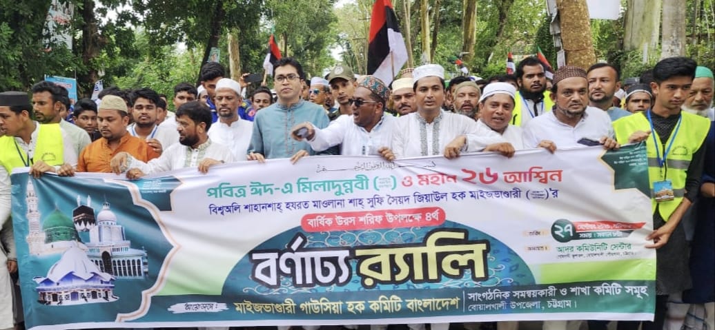 পবিত্র ঈদে মিলাদুন্নবী (স.) ও মহান ২৬ আশ্বিন বিশ্বঅলি শাহানশাহ হযরত সৈয়দ জিয়াউল হক মাইজভাণ্ডারী (ক.) এর ৩৭ তম উরস শরিফ উপলক্ষে মাইজভাণ্ডারী গাউসিয়া হক কমিটি বাংলাদেশ। চট্টগ্রাম জেলার বোয়ালখালী উপজেলার সমন্বয়কারী ও শাখা সমূহের যৌথ উদ্যোগে বর্ণাঢ্য র্যালি ও মিলাদ মাহফিল অনুষ্ঠিত।গত শনিবার(২৭ সেপ্টেম্বর)সকাল ৯ টায় বোয়ালখালী ফুলতলীস্হ কমিউনিটি সেন্টারে র্যালির উদ্বোধন মাধ্যমে সুচনা করেন বোয়ালখালী উপজেলা নির্বাহী কর্মকর্তা মোহাম্মদ রহমত উল্লাহ।