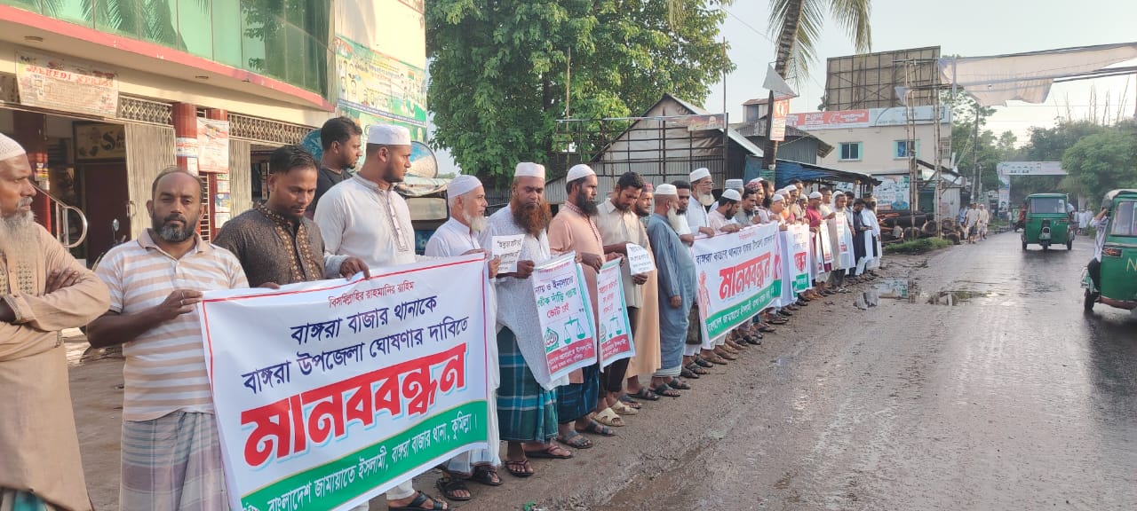 কুমিল্লার বাঙ্গরা বাজার থানাকে উপজেলা ঘোষণা করার দাবিতে মানববন্ধন করেছে বাংলাদেশ জামায়াতে ইসলামী বাঙ্গরা শাখা।