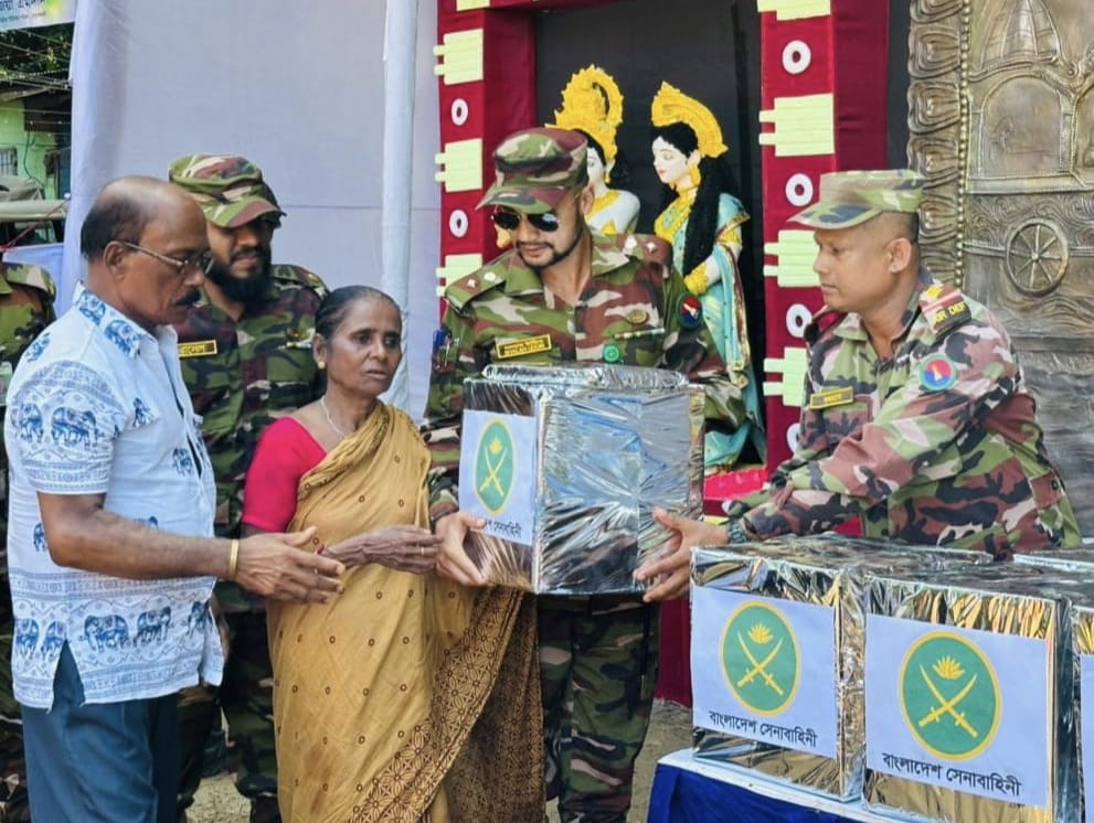 সেনাবাহিনীর উদ্যোগে বোয়ালখালীতে দুর্গাপূজায় খাদ্য ও বস্ত্র বিতরণ”