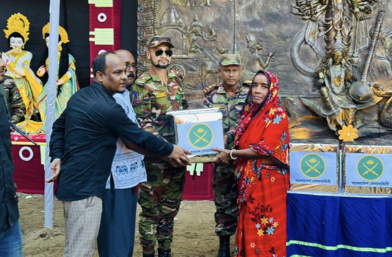 সনাতন ধর্মাবলম্বীদের অন্যতম ধর্মীয় উৎসব শারদীয় দুর্গা পূজা উপলক্ষ্যে গত সোমবার (২৯ সেপ্টেম্বর) সকালে চট্টগ্রাম জেলার বোয়ালখালী উপজেলায় সেনাবাহিনী এডহক ৪৮ এয়ার ডিফেন্স রেজিমেন্টের কমান্ডিং অফিসার বিএ-৭৭৩৭ লেঃ কর্ণেল সালাহ উদ্দিন আল মামুন, পিএসসি, জি+ উপজেলার গুরুত্বপূর্ণ মন্ডপগুলো পরিদর্শন করেন এবং আমুচিয়া ইউনিয়নের ধোরলা মুক্তি সংঘ পূজা মন্ডপে স্থানীয় সনাতন ধর্মাবলম্বীদের মাঝে উপহারস্বরূপ খাদ্য ও বস্ত্র সামগ্রী বিতরণ করেন।