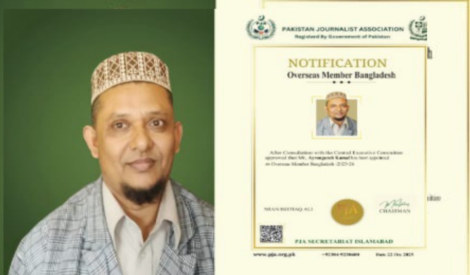 ঢাকা প্রেসক্লাবের সভাপতি ও সিনিয়র সাংবাদিক আওরঙ্গজেব কামাল-কে পাকিস্তান জার্নালিস্ট অ্যাসোসিয়েশনের (PJA) কেন্দ্রীয় কমিটির সদস্য হিসাবে ঘোষণা করেছেন সংগঠনের চেয়ারম্যান ও ডেইলি ফাইন রিপোর্ট পত্রিকার সম্পাদক ইশতিয়াক আলী। আজ বুধবার এক আনুষ্ঠানিক বিজ্ঞপ্তির মাধ্যমে এই ঘোষণা দেন ইশতিয়াক আলী। তিনি বলেন, “বাংলাদেশসহ আন্তর্জাতিক অঙ্গনে সাংবাদিক সমাজের ঐক্য ও সহযোগিতা জোরদারে আওরঙ্গজেব কামালের ভূমিকা গুরুত্বপূর্ণ হবে। উল্লেখ্য, আওরঙ্গজেব কামাল দীর্ঘদিন ধরে সাংবাদিকতা পেশায় সক্রিয়ভাবে সাংবাদিকদের পাশে থেকে কাজ করে যাচ্ছেন। তিনি বর্তমানে দৈনিক ক্রাইম সংবাদ ও দৈনিক ডিটেকটিভ নিউজ পত্রিকার সম্পাদক এবং ঢাকা প্রেসক্লাবের সভাপতি হিসেবে দায়িত্ব পালন করছেন। এই নিয়োগের মাধ্যমে বাংলাদেশের একজন বিশিষ্ট সাংবাদিক হিসেবে আন্তর্জাতিক সাংবাদিক সংগঠনে তাঁর সম্পৃক্ততা এক নতুন দিগন্তের সূচনা করল।