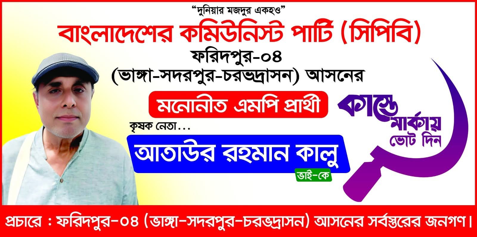 ফরিদপুর-০৪ আসনে বাংলাদেশের কমিউনিস্ট পার্টির পক্ষ থেকে সংসদ সদস্য প্রার্থী ঘোষণা করা হলো।