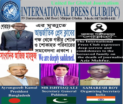 ঢাকা প্রেস ক্লাবের কেন্দ্রীয় কমিটির সহ-সভাপতি ও বাংলাদেশ রিপোর্টার্স সোসাইটির চেয়ারম্যান সাংবাদিক মোঃ আজিজ মাহফুজের ইন্তেকালে গভীর শোক ও শোকাহত পরিবারের প্রতি সমবেদনা জানিয়েছেন আন্তর্জাতিক প্রেস ক্লাব ও ঢাকা প্রেস ক্লাবের সভাপতি আওরঙ্গজেব কামাল এবং সংগঠনের সাধারণ সম্পাদক ও পাকিস্তান জার্নালিস্ট অ্যাসোসিয়েশনের চেয়ারম্যান মির ইস্তিয়াক আলী। এছাড়া শোক প্রকাশ করেছেন আন্তর্জাতিক প্রেস ক্লাব ও সংগঠনিক সম্পাদক সমরেশ রায় (ভারত), দপ্তর সম্পাদক আলহাজ্ব মোঃ সোহাগ (সৌদি আরব), মহিলা বিষয়ক সম্পাদক শম্পা দাশ (ভারত), রিনজিন ওয়াংচুক ও শেরিং দর্জি (ভুটান), এন. বিথ্যাথরন ও মঙ্গলনাথ লিয়ানারাচ্চি (শ্রীলঙ্কা), রামাবহাদুর রাওয়াল ও কাশীন্দ্র শর্মা (নেপাল), কিয়াও সোয়ে ও কিয়াও মিও মিন (বার্মা), শরণজিৎ সিং, আহমেদ জৈনি কামারুজ্জামান (মালয়েশিয়া), মোহাম্মদ ফাহাদ আল-হারথি (সৌদি আরব), আন্দ্রে রিখটার, ক্রিস্টফ প্লেট, সোহেল সরকার (যুক্তরাজ্য), দিলীপ রায় (কলকাতা) এবং শেখ মোস্তাফিজুর রহমান (বাংলাদেশ)। এছাড়া যৌথ শোকবার্তায় আরও শোক প্রকাশ করেছেন—