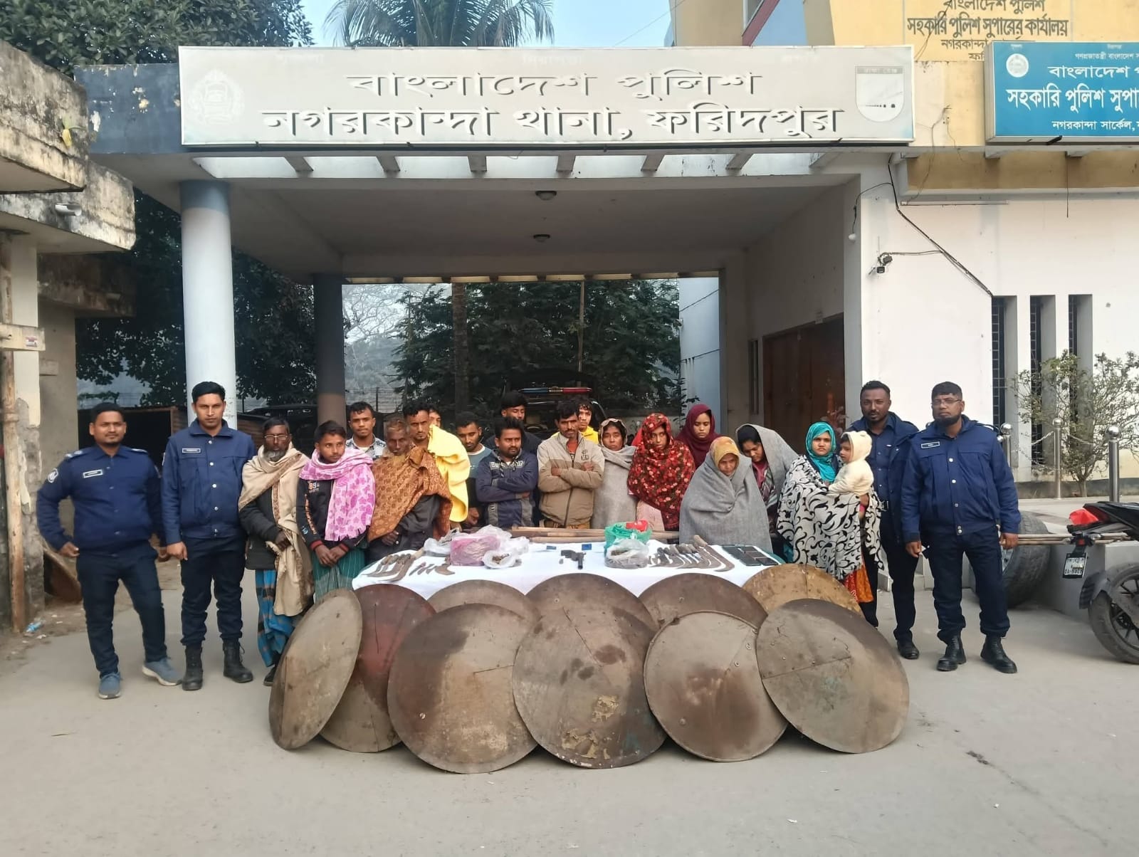 ফরিদপুরের নগরকান্দা উপজেলার তালমা ইউনিয়নের শাকপালদিয়া গ্রাম থেকে ২২ জানুয়ারি মোঙ্গলবার ভোর রাতে যৌথবাহীনির অভিযানে ১৮ জন দুষ্কৃতকারীকে আটক করা হয়েছে। এসময় তাদের কাছ থেকে ০১টি সিঙ্গেল ব্যারেল পাইপ গান, ০১টি কার্তুজ (১২ গেজ), ১০টি ঢাল, ০৭টি কাতরা , ০৮টি কাস্তে, ০৬টি রামদা, ০৫টি ছোট ছুরি, ০৪ কেজি গাঁজা এবং ১০২ পিস ইয়াবা, ০৬টি অ্যান্ড্রয়েড ফোন এবং ০১টি বাটন ফোন উদ্ধার করা হয়।