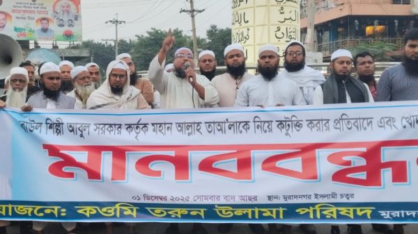 মহান আল্লাহ, পবিত্র কোরআন ও ইসলাম নিয়ে কটূক্তি করায় বাউল আবুল সরকারের দৃষ্টান্তমূলক শাস্তির দাবিতে মানববন্ধন করেছে মুরাদনগর উপজেলা কওমি তরুন ওলামা পরিষদ। সোমবার (১ ডিসেম্বর) বাদ আসর মুরাদনগর আল্লাহ